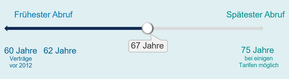 - Laut Versicherungsbedingungen müssen Sie mindestens 62 Jahre alt sein, bei Verträgen vor 2012 mindestens 60 Jahre. Eine Verschiebung des Leistungsbeginns ist bei manchen Tarifen sogar bis zu einem Alter von maximal 75 Jahren möglich.